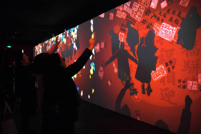 1月21日,人們體驗(yàn)數(shù)字沉浸體驗(yàn)展“納福迎祥”部分,張開手臂,收納從天而降的吉慶百福。