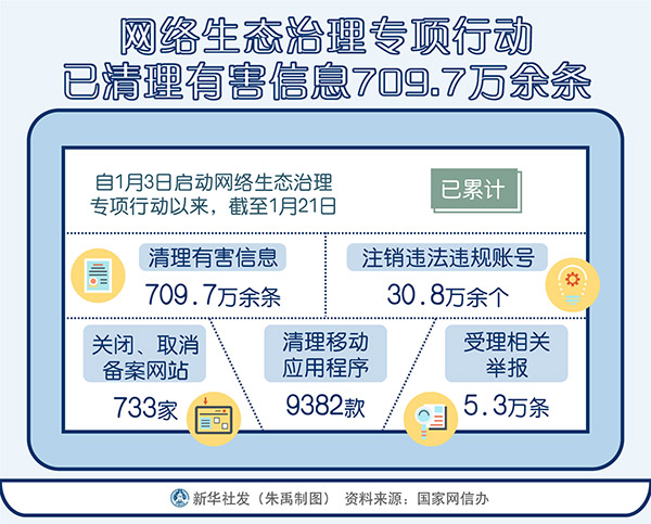 圖表:網(wǎng)絡(luò)生態(tài)治理專項(xiàng)行動(dòng)已清理有害信息709.7萬(wàn)余條 新華社發(fā) 朱禹 制圖