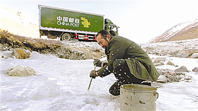 冰雪天氣,其美多吉在雪線郵路鑿冰取水 圖據(jù)工人日報