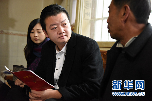 四川省敘永縣后山鎮三斗米村駐村第一書記胡凌鳴(右一)在貧困戶趙世蓮(右二)家了解脫貧進展情況(1月15日攝)。新華社記者 陳天湖 攝