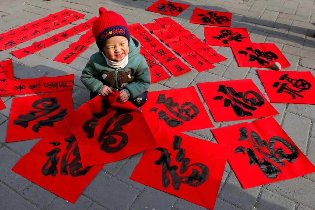 2019-1-28,河北涉縣更樂(lè)鎮(zhèn)。新春到來(lái)之際,書協(xié)的朋友們?cè)诖髲R里揮毫潑墨寫春聯(lián)送鄉(xiāng)親,村娃跑來(lái)湊熱鬧,蹲在福字里陶醉,幸福又快樂(lè)。作者:滄海