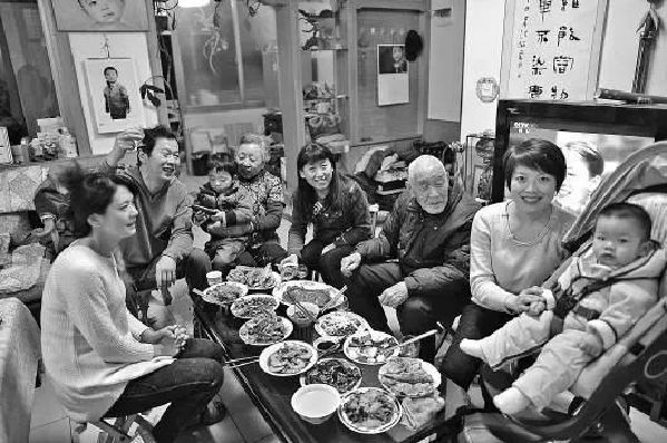 1953年,天津市漢沽區(qū)蘆臺王德鑄(左一)一家吃團(tuán)圓飯。
