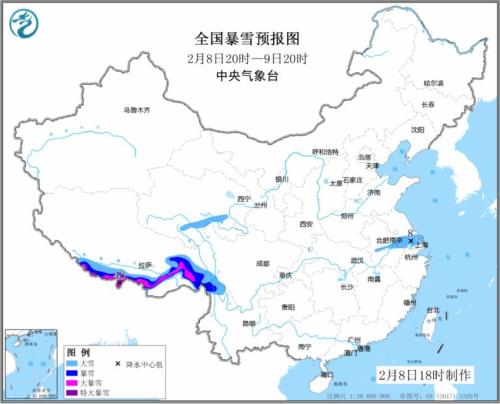 2月8日20時至9日20時,青藏高原東部和南部、甘肅中部和南部、蘇皖大部等地的部分地區有中到大雪或雨夾雪,其中,西藏南部和東部的部分地區有暴雪,局地有大暴雪或特大暴雪(30~40毫米)。西藏東南部、江南大部、西南地區東部和華南北部等地有小到中雨,其中,西藏東南部、云南西北部等地局地有大雨或暴雨(25~80毫米)。西藏中西部、華北北部、遼東半島、江漢、江南東北部等地的部分地區有4~6級風。