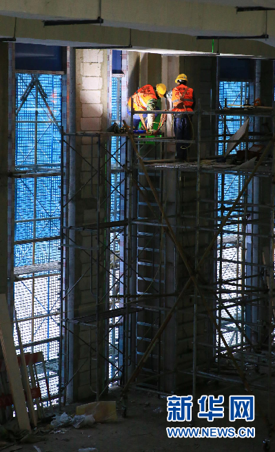 圖片說明:龍雪波向記者介紹,離竣工還剩136天,工人們以飽滿的精神努力工作。攝影:新華網錢春弦