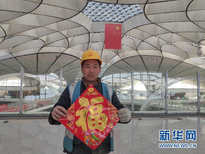 圖片說明:大興機場航站樓春節期間值守的工人舉起了“福”字。 攝影:新華網錢春弦