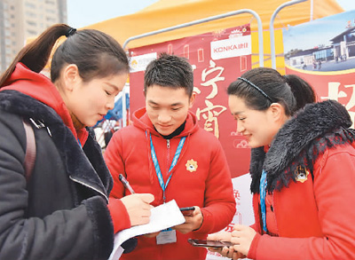 2月12日,湖北省通城縣在銀山廣場舉辦2019年推動返鄉就業、助力脫貧攻堅暨“春風行動”企業用工現場招聘會,共推出1萬多個就業崗位,工種300余個,可滿足本縣不同年齡段勞力在家門口就業。圖為求職者在招聘會上咨詢應聘。劉建平攝 (人民視覺)