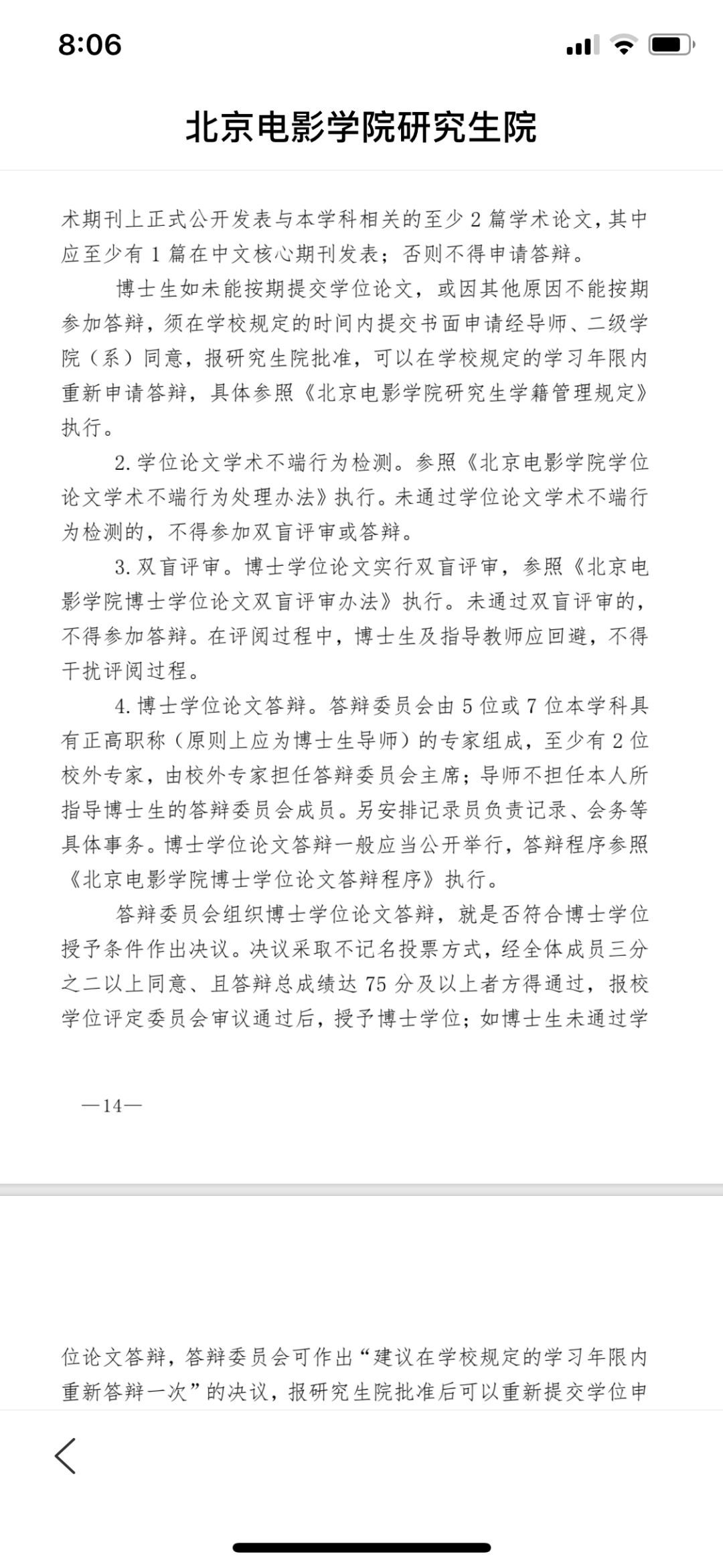 新聞縱橫編輯在北京電影學(xué)院的官網(wǎng)上,查到了博士學(xué)位申請的相關(guān)規(guī)定。翟天臨需要在答辯前,在國內(nèi)一級刊物或國際核心刊物上發(fā)表或被接受發(fā)表至少一篇入學(xué)后獨立撰寫的學(xué)術(shù)論文。寫出具有博士水平的學(xué)位論文;也就是說,他必須具有博士水平論文的寫作能力,由指導(dǎo)教師推薦,才能可提出學(xué)位申請,這是第一步。