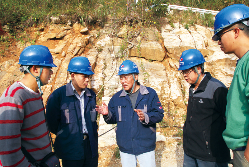 南仁東(左三)與工程技術人員在黔南州平塘縣大窩凼檢查施工進度 新華社照片 中科院國家天文臺供圖