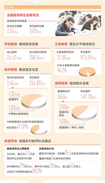 2018年,我國各級各類教育均取得較大成就。學前教育快速發展,九年義務教育繼續鞏固,大班額、超大班額大幅下降,絕大多數義務教育學校達到辦學底線要求,偏遠山區教學點變得小而美、小而全,貧困地區教師隊伍煥發新活力,高考綜合改革試點各地因地制宜制定方案……教育改革發展的各項工作正蹄疾步穩、有序推進。