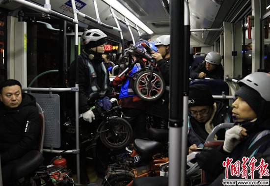 夜30路上有許多他的“車友”,其中一些是專門去鳳凰嶺等地爬山的,拄著登山杖,戴著裹住下巴的頭巾,背著登山包,這批人自稱“山友”。車里年齡最大的是一對老夫婦,83歲了,每天上車都有人把最穩當的座位讓給他們。車上曾經有位老人,“出勤率”比別人都高,被戲稱為“車長”。后來“車長”搬了家,改乘其他線路了。這些老人回程時往往已經天亮,但他們大多不愛坐地鐵,覺得“公交車更方便”。