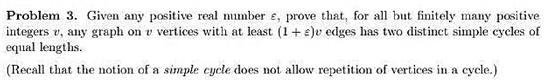 讓中國隊(duì)全軍覆沒的第3題,翻譯過來的大致意思是:給定任何一個(gè)正實(shí)數(shù)e,證明除了有限個(gè)正整數(shù)以外的所有正整數(shù)v,任何有v個(gè)頂點(diǎn)并且有大于等于 (1+e)v條邊的圖至少包含兩個(gè)不同的等長(zhǎng)簡(jiǎn)單回路。