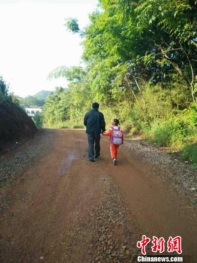 愛心志愿者康雄牽著“事實孤兒”去上學的背景。 長沙市岳麓區大愛無疆公益文化促進會供圖 攝