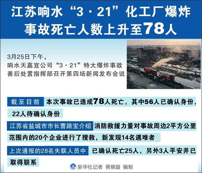 新華社響水3月25日電(記者朱國亮)25日下午,響水天嘉宜公司“3·21”特大爆炸事故善后處置指揮部召開第四場新聞發布會說,截至目前,本次事故死亡人數上升至78人。