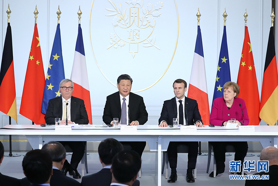 3月26日,國家主席習近平在巴黎同法國總統馬克龍一道出席中法全球治理論壇閉幕式。德國總理默克爾、歐盟委員會主席容克應邀出席。 新華社記者 鞠鵬 攝