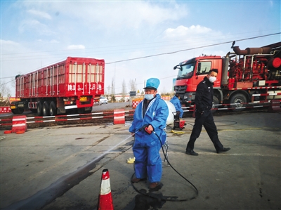 陜西省榆林市靖邊縣發生非洲豬瘟疫情后,3月9日,靖邊張家畔一公路交叉口,工作人員在交警配合下,對過往車輛噴灑消毒液。 圖/視覺中國