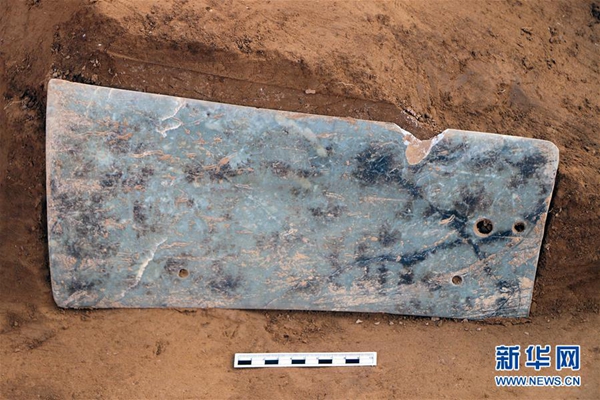 這是陜西延安蘆山峁新石器時代遺址營盤梁院落北門外祭祀坑出土大玉刀(資料照片)。新華社發