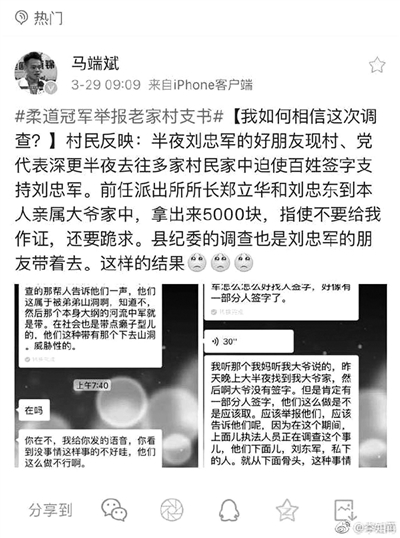 3月28日23時46分,舉報家鄉村官貪腐的柔道冠軍馬端斌通過個人實名認證的微博發消息稱,其父親深夜被不明身份人員帶走,一時聯系不上父親,打電話一直沒人接,擔心其因為自己舉報的事情被為難。