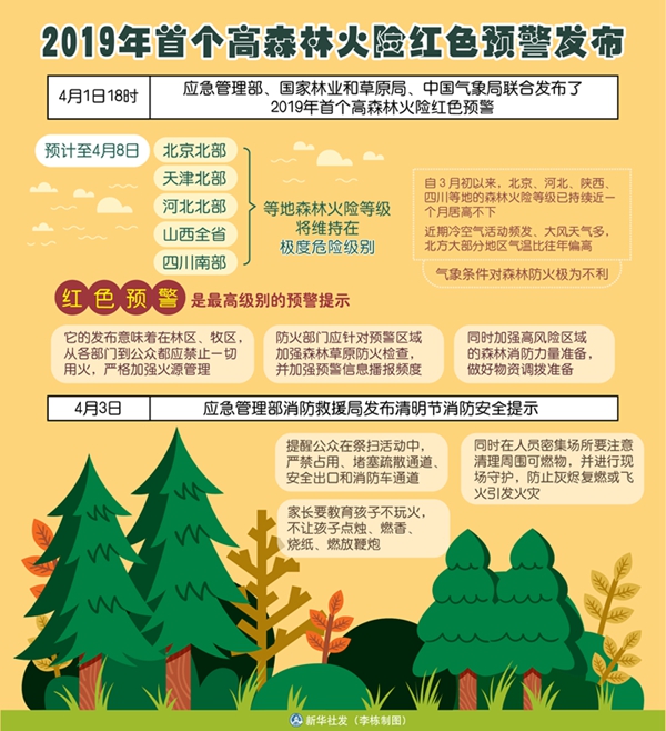 “此次紅色預警是三部門綜合考慮氣象條件、林區(qū)物候及衛(wèi)星林火監(jiān)測、清明節(jié)期間祭掃影響等情況,經過會商研判共同發(fā)布的。”中國氣象局公共氣象服務中心副首席楊曉丹說,自3月初以來,北京、河北、陜西、四川等地的森林火險等級一直居高不下,已持續(xù)近一個月;近期冷空氣活動頻發(fā)、大風天氣多,北方大部分地區(qū)氣溫比往年偏高,氣象條件對森林防火極為不利。