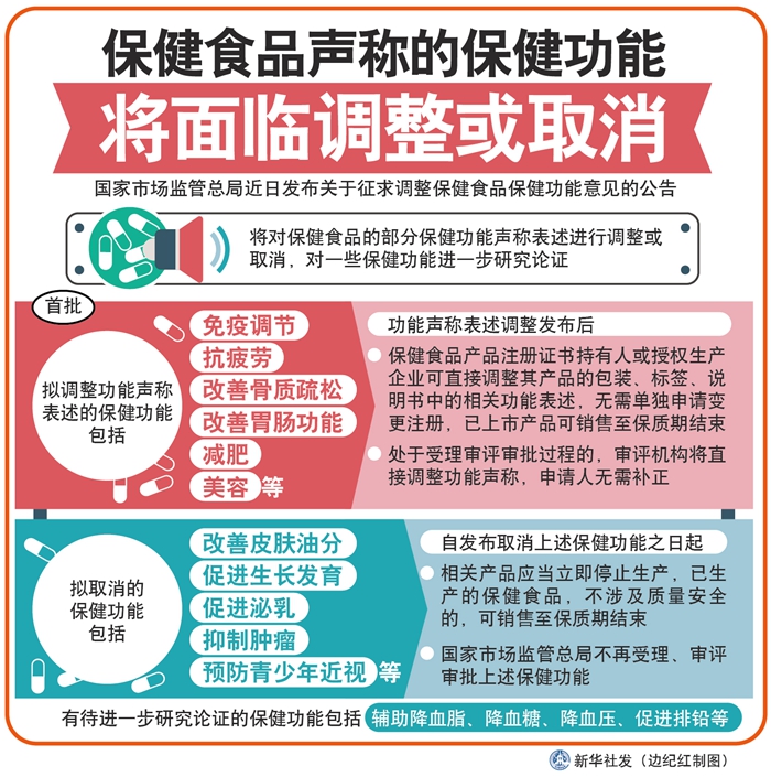 國家市場監(jiān)管總局在對不同歷史時期批準(zhǔn)的保健功能進(jìn)行梳理匯總的基礎(chǔ)上,組織醫(yī)學(xué)、藥學(xué)、食品、營養(yǎng)等領(lǐng)域?qū)<疫M(jìn)行多次論證,研究提出了調(diào)整保健功能的意見。堵塞保健食品功能聲稱被虛假宣傳的漏洞,提升消費者對保健食品功能聲稱的科學(xué)認(rèn)知和準(zhǔn)確判定,避免與藥品疾病預(yù)防和治療作用混淆。