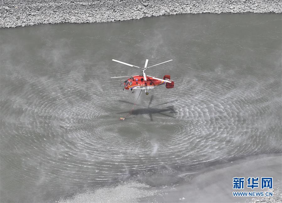 4月2日,救援直升機在火場附近河道內取水,準備進行空中滅火工作。新華社記者 劉坤 攝