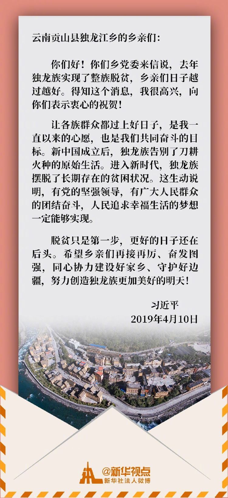 2018年,獨龍江鄉(xiāng)6個行政村整體脫貧,獨龍族實現(xiàn)整族脫貧。當(dāng)?shù)厝罕娢朽l(xiāng)黨委給習(xí)近平總書記寫信,匯報獨龍族實現(xiàn)整族脫貧的喜訊,表達了繼續(xù)堅定信心跟黨走、為建設(shè)好家鄉(xiāng)同心奮斗的決心。