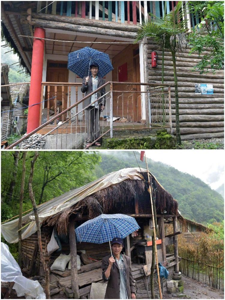 拼版照片:上圖為獨龍江鄉(xiāng)巴坡村的普學(xué)清站在新建的安居房臺階上;下圖為普學(xué)清站在以前居住的茅草屋前(2017年5月25日攝)
