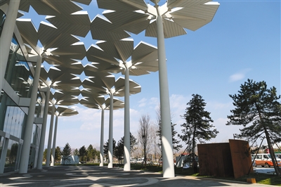 國際館由94把“花傘”構成,建筑師在若干朵“花傘”下留出開放的公共空間,像一個城市遮陽傘,為人們提供一個遮陽的休憩區。