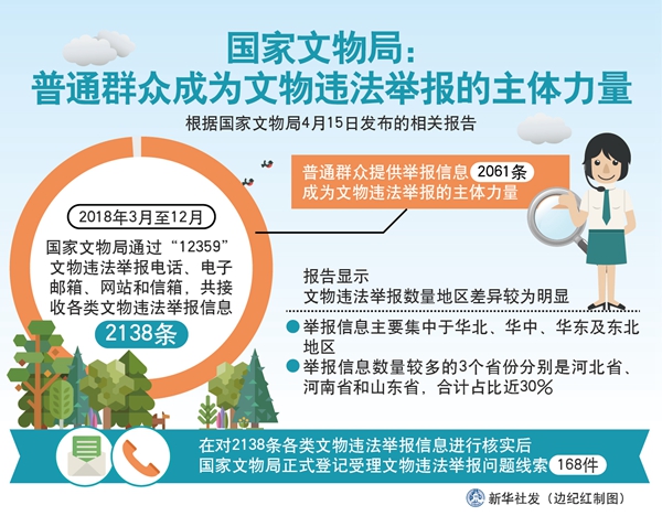 新華社北京4月15日電(記者施雨岑)根據國家文物局15日發布的相關報告,2018年3月至12月,國家文物局通過“12359”文物違法舉報電話、電子郵箱、網站和信箱,共接收各類文物違法舉報信息2138條。普通群眾提供舉報信息2061條,成為文物違法舉報的主體力量。