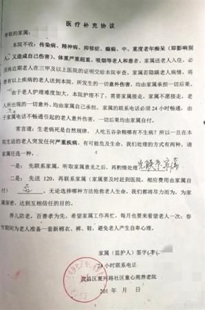 接收老人前,童心苑要求老人家屬簽訂的醫(yī)療補充協議。