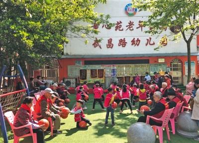 這是一場老幼同樂活動,孩子和老人來自武漢市的老幼同養(yǎng)機構——童心苑。童心苑實際是個代稱,由武昌路幼兒園和武昌區(qū)復興路社區(qū)的童心苑老年公寓(下稱“老年公寓”)共同組成。在這里,養(yǎng)老院和幼兒園開在一起,老人和幼兒結合供養(yǎng)。