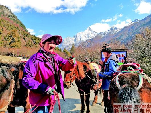 有“東方阿爾卑斯山”之稱的四姑娘山,位于四川阿壩藏族羌族自治州小金縣境內(nèi),與“大熊貓的故鄉(xiāng)”——臥龍自然保護區(qū)接壤。由于生態(tài)環(huán)境保護的特殊性,不少觀光地點車輛無法進入,只能徒步穿越或者騎馬進山,馬匹具有十分重要地位。“一開始,我一個人牽馬,沒有統(tǒng)一的組織和管理,一天有時候只能掙三四十元,有的游客還擔(dān)心是否安全,不敢坐。”扎西告訴記者,村里統(tǒng)一管理以后,村民接受了專業(yè)培訓(xùn)、收費透明,選擇坐馬穿越長坪溝和海子溝的游客越來越多。如今,長坪村有牽馬師700余人,牽馬成為村民重要的收入來源。