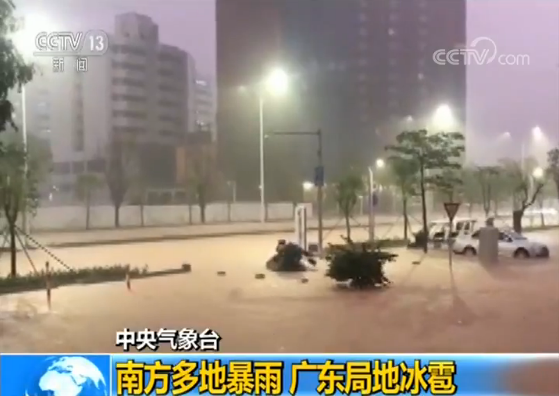 中央氣象臺監測顯示,昨天廣東、廣西、福建、江西、湖南等地部分地區出現暴雨或大暴雨;廣東中部和珠江口附近還伴有8~10級雷暴大風,局地出現冰雹。