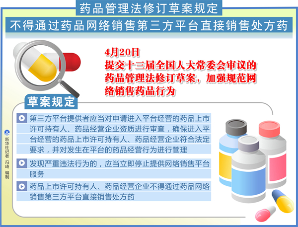 新華社北京4月20日電(記者趙文君)20日提交十三屆全國人大常委會審議的藥品管理法修訂草案,加強規范網絡銷售藥品行為,明確不得通過藥品網絡銷售第三方平臺直接銷售處方藥。