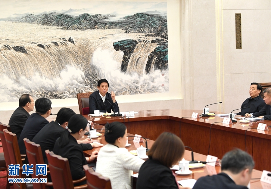 4月20日,中共中央政治局常委、全國人大常委會委員長栗戰書在北京同列席十三屆全國人大常委會第十次會議的全國人大代表座談。 新華社記者 饒愛民 攝