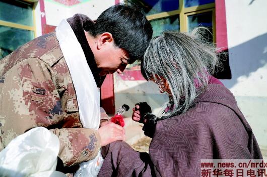 2018年春節(jié)期間,鄒凌(左)在海拔4000多米的玉樹地震災(zāi)區(qū)甘達(dá)村看望79歲的藏族老人尕旦增。受訪者供圖