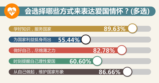 大學(xué)生表達(dá)愛(ài)國(guó)的方式更加務(wù)實(shí),94.03%的受訪者認(rèn)為“理性愛(ài)國(guó)是最好的方式”。超過(guò)80%的大學(xué)生認(rèn)為愛(ài)國(guó)要先從自己做起,“學(xué)好知識(shí)、服務(wù)國(guó)家”“做好自己,為社會(huì)盡綿薄之力”等成為很多大學(xué)生的首選。陜西師范大學(xué)學(xué)生強(qiáng)德平說(shuō),愛(ài)國(guó)有三點(diǎn),第一是銘記歷史,第二是展望未來(lái),第三是把握當(dāng)下。中國(guó)人民大學(xué)學(xué)生張嘯寒說(shuō),走到人民生產(chǎn)實(shí)踐的第一線,是關(guān)心國(guó)家和社會(huì)的最好方式。