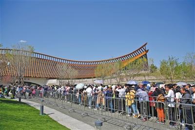 昨日,五一小長假第一天,世園會(huì)迎來開園后的首個(gè)客流高峰。圖為當(dāng)日下午三時(shí)許,中國館前排隊(duì)的游客。新京報(bào)記者 侯少卿 攝