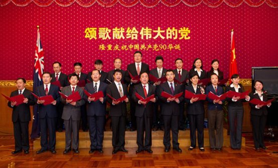 2011年7月1日,在澳大利亞首都堪培拉,中國駐澳大利亞大使陳育明(前中)與館員們合唱歌曲《我和我的祖國》。當日,中國駐澳大利亞大使館舉辦“頌歌獻給偉大的黨”活動,慶祝中國共產黨建黨90周年。 新華社發(白雪攝)