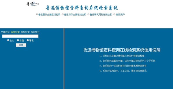 澎湃新聞?dòng)浾卟樵儼l(fā)現(xiàn),網(wǎng)友提到的“魯迅說(shuō)過(guò)的話”檢索系統(tǒng)其實(shí)正確名稱為“魯迅博物館資料查詢?cè)诰€檢測(cè)系統(tǒng)”(網(wǎng)址:http://cx.luxunmuseum.com.cn/)。根據(jù)官方介紹,該系統(tǒng)由北京魯迅博物館文物資料保管部整理,包括魯迅著作全編、譯作全編及研究月刊三個(gè)子系統(tǒng),而系統(tǒng)一切資料版權(quán)歸北京魯迅博物館所有。