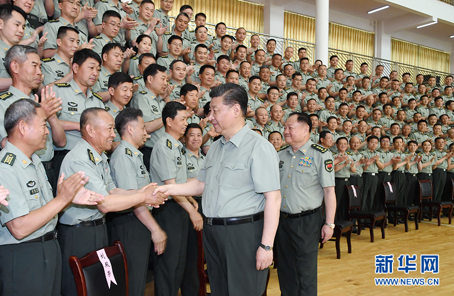 5月21日,中共中央總書記、國家主席、中央軍委主席習近平到陸軍步兵學院視察。這是習近平親切接見駐江西部隊副師職以上領導干部和建制團級單位主官、陸軍步兵學院本部正團職以上干部和石家莊校區主官、專家教授代表。新華社記者 李剛 攝