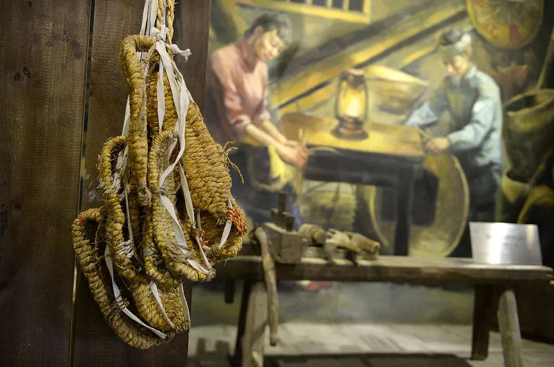 在于都縣中央紅軍長征出發紀念館內展示的草鞋和制作草鞋的工具。新華社記者 萬象 攝