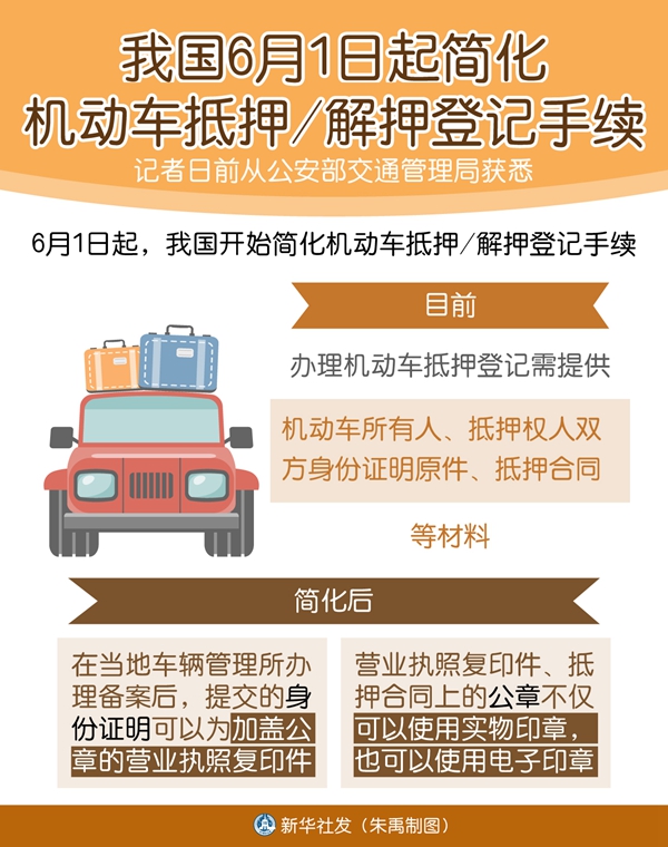 新華社北京5月28日電(記者王茜)6月1日起,我國開始簡化機動車抵押/解押登記手續。這是記者日前從公安部交通管理局獲悉的。