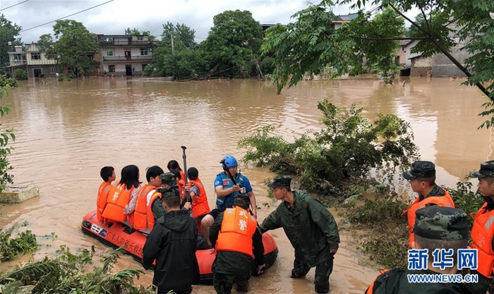 6月7日,武警江西省總隊上饒支隊官兵在玉山縣六都鄉六都村轉移被洪水圍困的群眾。新華社發(吳展 攝)