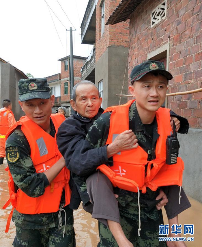 6月7日,武警江西省總隊上饒支隊官兵在玉山縣下鎮鎮白橋村轉移被洪水圍困的老人。新華社發(吳展 攝)