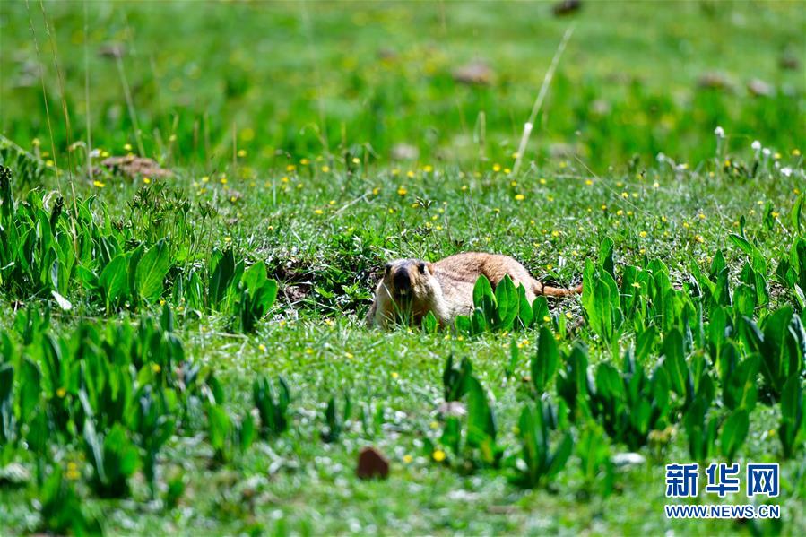 這是在青海省玉樹藏族自治州雜多縣昂賽鄉(xiāng)境內拍攝的旱獺(6月21日攝)。新華社記者 張龍 攝