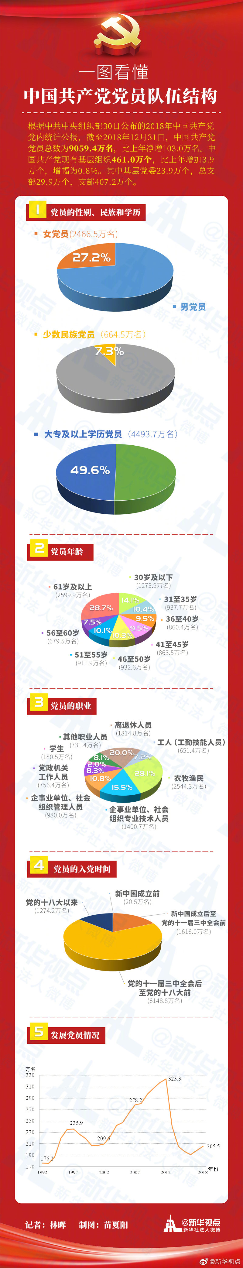 根據中共中央組織部30日公布的2018年中國共產黨黨內統計公報,截至2018年12月31日,中國共產黨黨員總數為9059.4萬名。想了解黨員的性別比例、學歷情況、職業分布……戳圖? ????