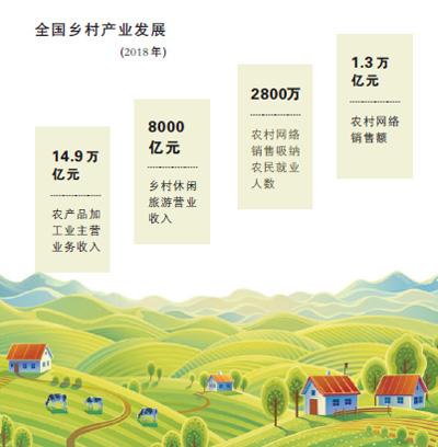 產業興旺是鄉村振興的基礎,是解決農村問題的前提。黨的十八大以來,鄉村產業呈現良好發展勢頭。2018年,糧食產能連續7年保持在1.2萬億斤以上,農產品加工業主營業務收入達14.9萬億元,鄉村休閑旅游營業收入超過8000億元,農業生產性服務業營業收入超過2000億元,農村網絡銷售額1.3萬億元,返鄉下鄉創新創業人員累計達780萬。