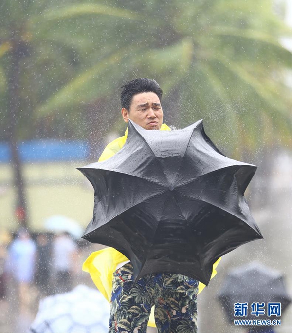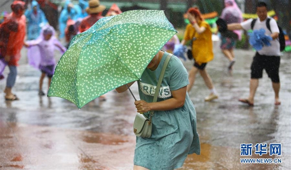 7月3日,行人在海南省三亞市街頭冒雨出行。新華社發(陳文武 攝)