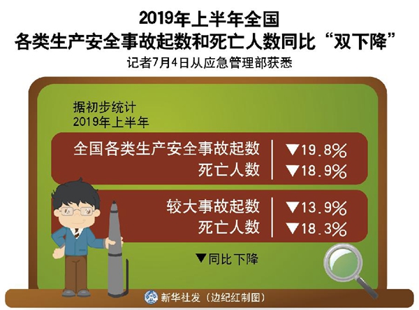 新華社北京7月4日電(記者魏玉坤、葉昊鳴)記者4日從應急管理部獲悉,據初步統計,今年上半年,全國各類生產安全事故起數和死亡人數同比分別下降19.8%和18.9%,較大事故起數和死亡人數同比分別下降13.9%和18.3%。