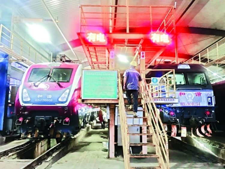 車頭每來回牽引完一趟列車,需回到檢修庫進行全身“體檢”。檢修團隊隨之登場,每臺車頭的檢修時間不能超過70分鐘,檢修完后,車頭就進入待命狀態(tài),按照計劃執(zhí)行新的牽引任務(wù)。
